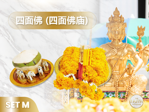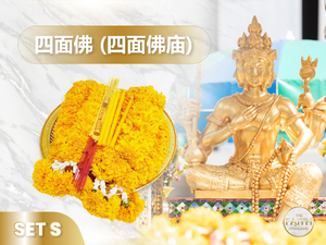 Set S (4 Garland Incense and candle), Set M ( 4 Garland 4 Incense and candle 1 coconut 1 pair of small elephants 1 pair of small horses ), Set L ( 4 Big garland Incense and candle 1 pair of big elephants 5 kinds of fruits ) |